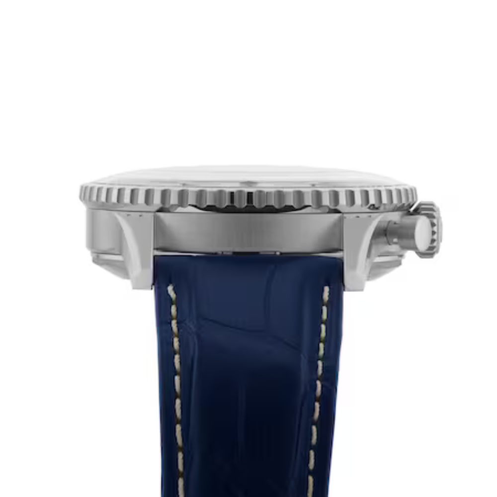 Paired with a deep blue alligator leather strap and stainless steel folding clasp, the watch provides a secure and refined fit on the wrist — stylish in the cockpit or on the ground.