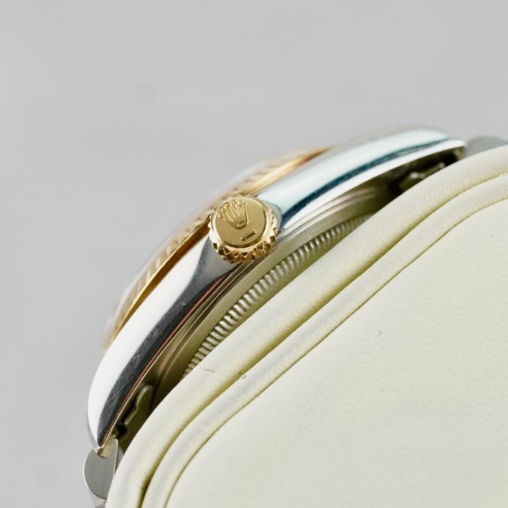 Its refined champagne sunray dial features classic luminous baton hour markers and Rolex’s signature Cyclops lens magnifying the date at 3 o’clock. Framed by the unmistakable fluted bezel in 18k yellow gold, the watch captures light with every movement — offering subtle brilliance without excess.
