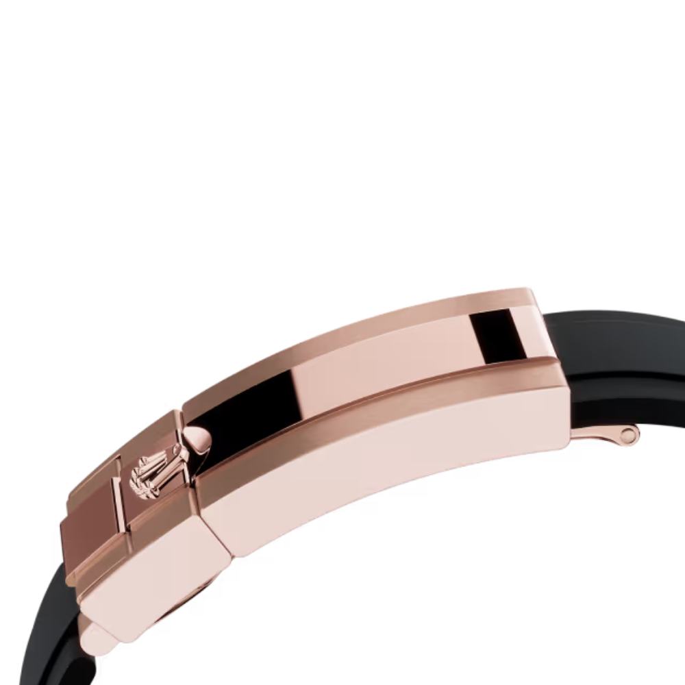 The Rolex Yacht‑Master 40 Ref. 126655‑0002 masterfully balances sporty performance with classic luxury. Crafted entirely from 18 ct Everose gold, this variant reflects Rolex’s commitment to distinctive elegance. It comes on an Oysterflex bracelet (flexible metal blades covered with elastomer) secured by an Oysterlock clasp and equipped with the Glidelock extension system, offering superb comfort and fit adjustment. The bidirectional rotating bezel, featuring a 60-minute graduated scale and a matte-black Cerachrom insert, elegantly combines functionality and visual refinement.