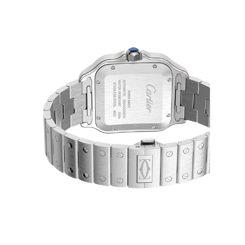 At its core lies the Cartier calibre 1847 MC — an automatic mechanical movement celebrated for its durability, reliability, and anti-magnetic properties. The timepiece is protected by a scratch-resistant sapphire crystal and features a transparent case back showcasing the beautifully finished movement inside.