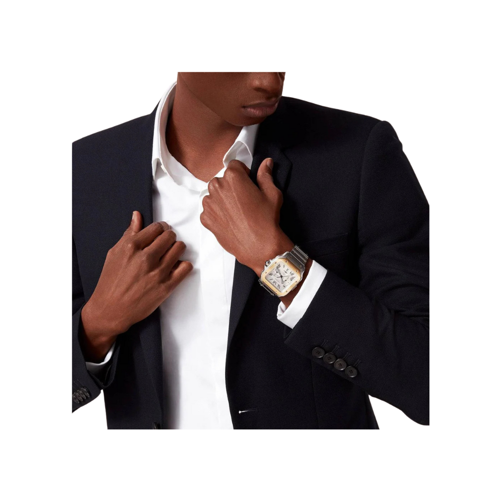 The Santos de Cartier XL Chronograph Steel & 18ct Yellow Gold Watch is a bold reimagining of Cartier’s iconic aviation timepiece, now fused with chronograph functionality for the modern gentleman. With its luxurious combination of stainless steel and 18ct yellow gold, this XL model commands attention, blending sporty precision with refined elegance.